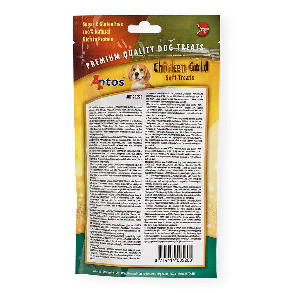 These great-tasting Antos Chicken Gold sticks are made with real chicken as the #1 ingredient. They are deliciously wholesome snacks with authentic chicken and do not contain any additives. Its satisfyingly chewy texture pairs perfectly with the fan-favourite chicken flavour to get their tail wagging each time you open the bag.