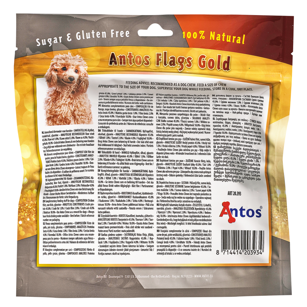 Give your furry friend the ultimate treat with Antos Flags Gold. A delicious combination of a rawhide stick then wrapped with real chicken for a taste your canine craves. These premium dog treats are high in protein that satisfies and nourishes in every bite. Simply nothing but the best!