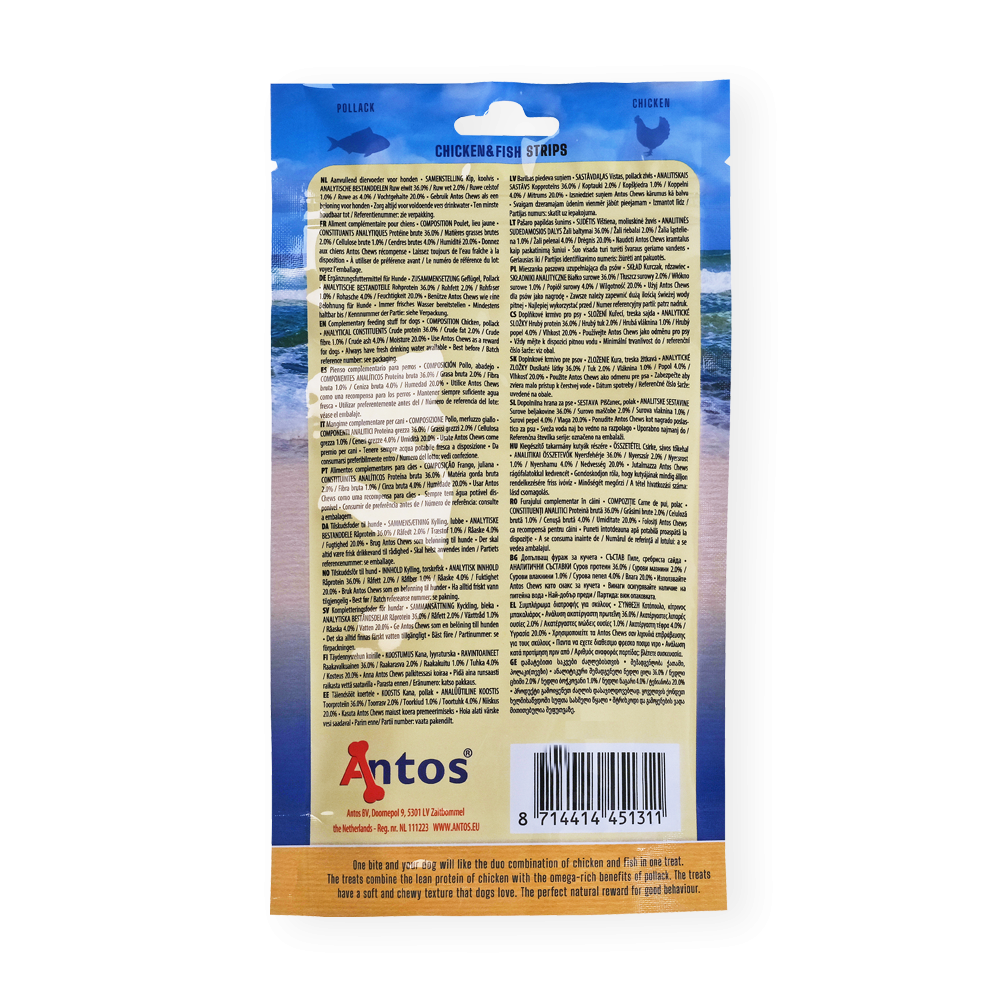Give your dog a shiny smile in the tastiest way with our Chicken&Fish Strips. Made with just two ingredients of chicken and pollack, these great treats give plenty of benefits for your beloved friend.