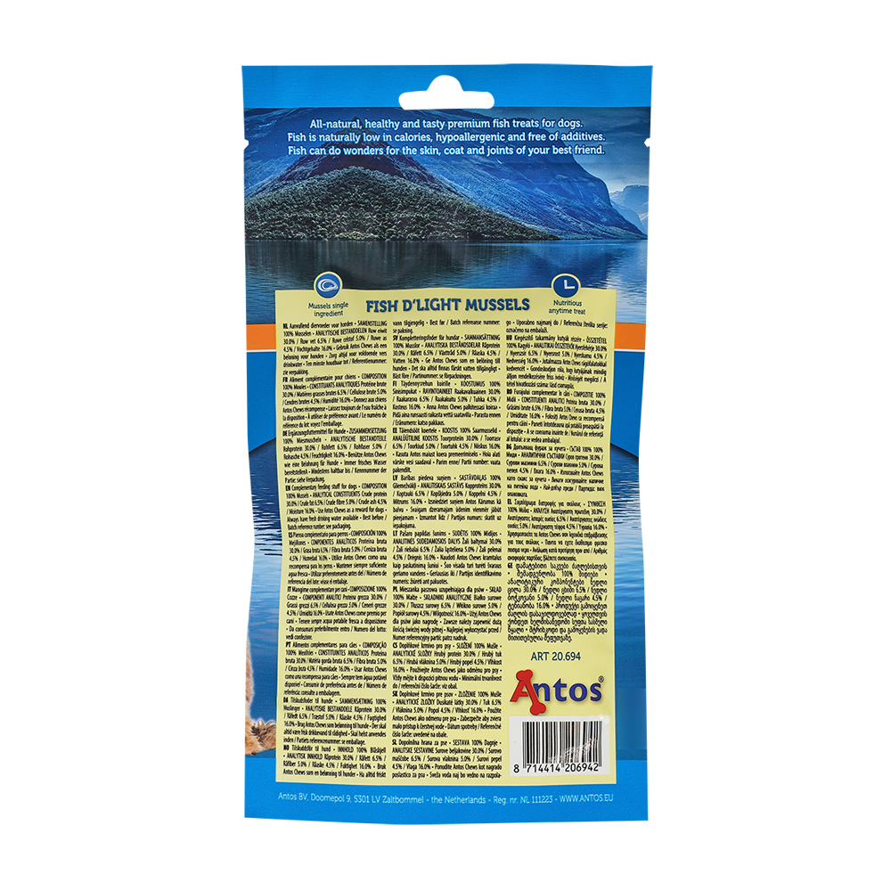 From sea to snack, naturally delicious. Our Fish D’light Mussels make an excellent natural treat for dogs, packed with high-quality protein and essential nutrients. Mussels are especially rich in omega-3 fatty acids, which support healthy skin a shiny coat and joint mobility. These tiny treats are naturally dried, easily digestible and mighty in flavour.
